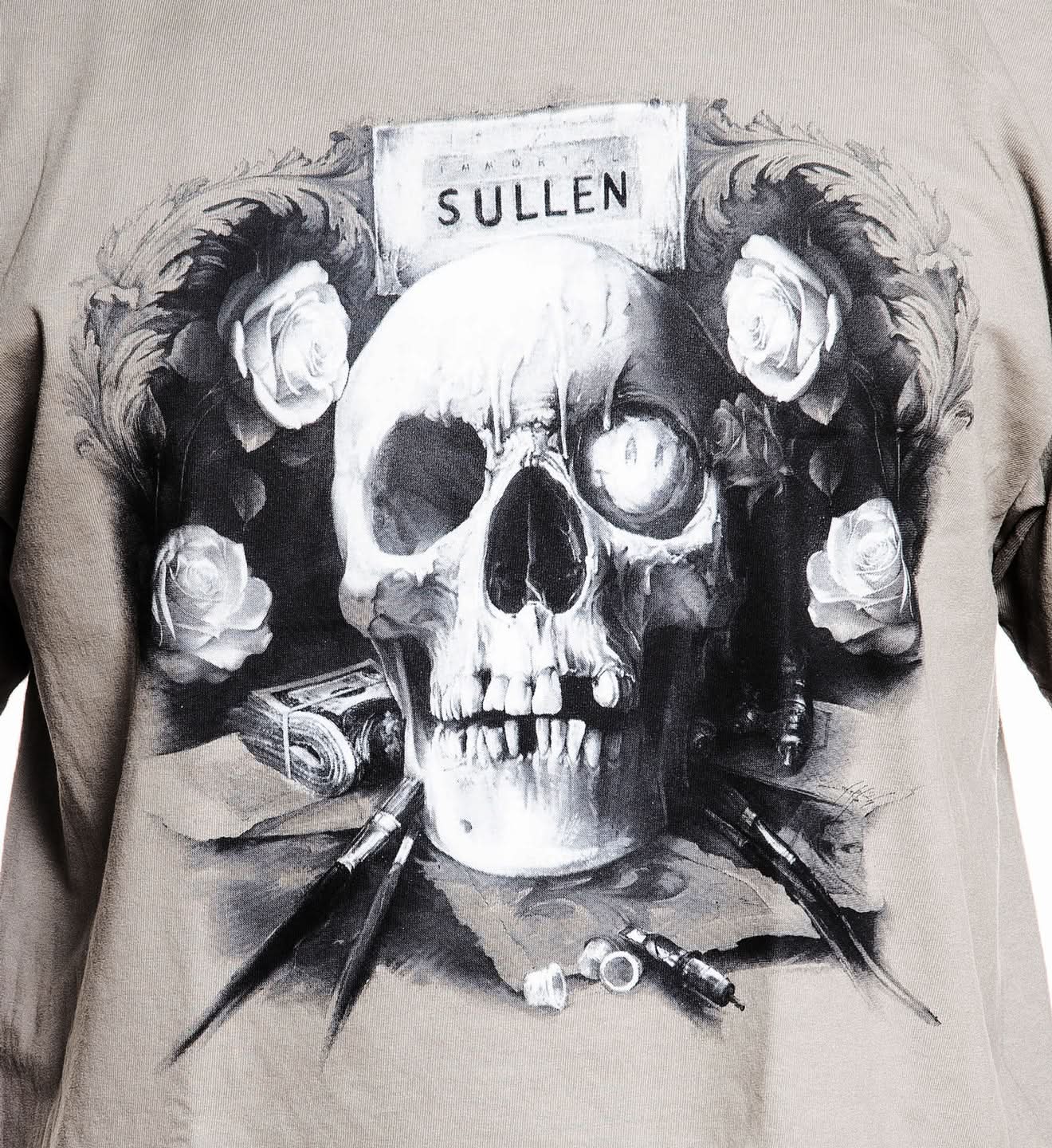 Immortal by @djagarta centers a stark skull surrounded by roses and supplies, blending permanence and craft in a layered grayscale composition. Printed on our oversized 1 Ton tee, with a wider fit that gives the artwork room to sit heavy and hit clean.